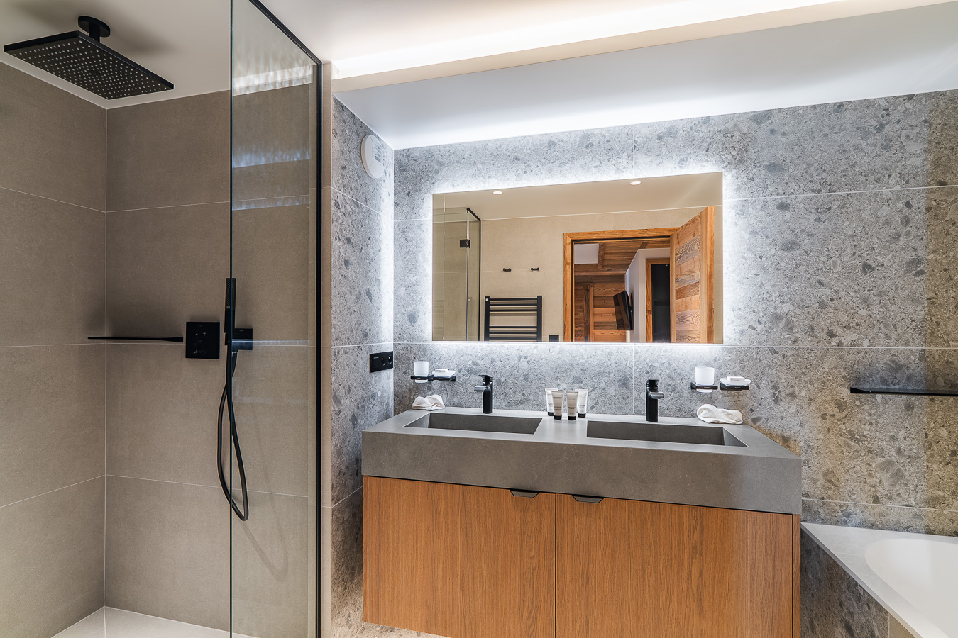 Il dispose de six chambres avec un lit double ainsi que de six salles de bains. La pièce de vie bénéficie d'un coin salon avec une télévision et une cheminée à bois ainsi que d'une cuisine toute équipée. Ce chalet dispose d'un ascenseur, d'une cave à vins, d'une salle de cinéma, d'une buanderie avec lave-linge et sèche-linge, d'appareils électroménagers tels qu'un lave vaisselle, une machine à café Nespresso, le nécessaire de cuisine, etc. Le petit + : un espace bien-être privé avec piscine et sauna intérieur et bain à remous extérieur.