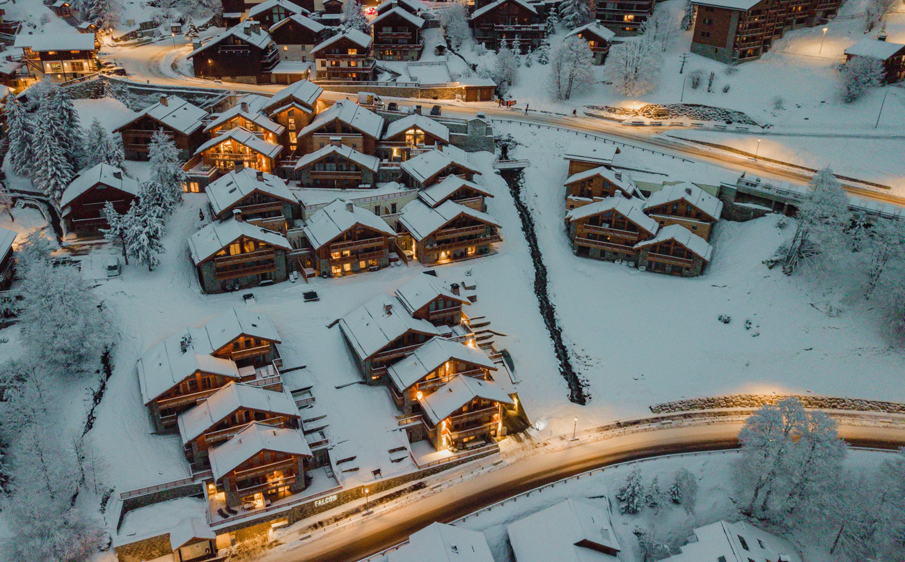 Meanwhile, in Meribel, a charming mountain resort which sits at the heart of the 3 Valley’s ski area, our Falcon resort also came to life in time for the winter 2023-2024 season. Falcon is a collection of 32 exclusive apartments and 3 chalets and sits just 150 metres from the slopes. We designed Falcon to have an authentic village feel in terms of the architecture, with 11 chalets arranged around a beautiful wellness area, complete with a swimming pool and a Spa for care treatments, a ski-shop and a reception. Our Falcon home owners also enjoy private storage cellar, allocated parking and exceptional views.