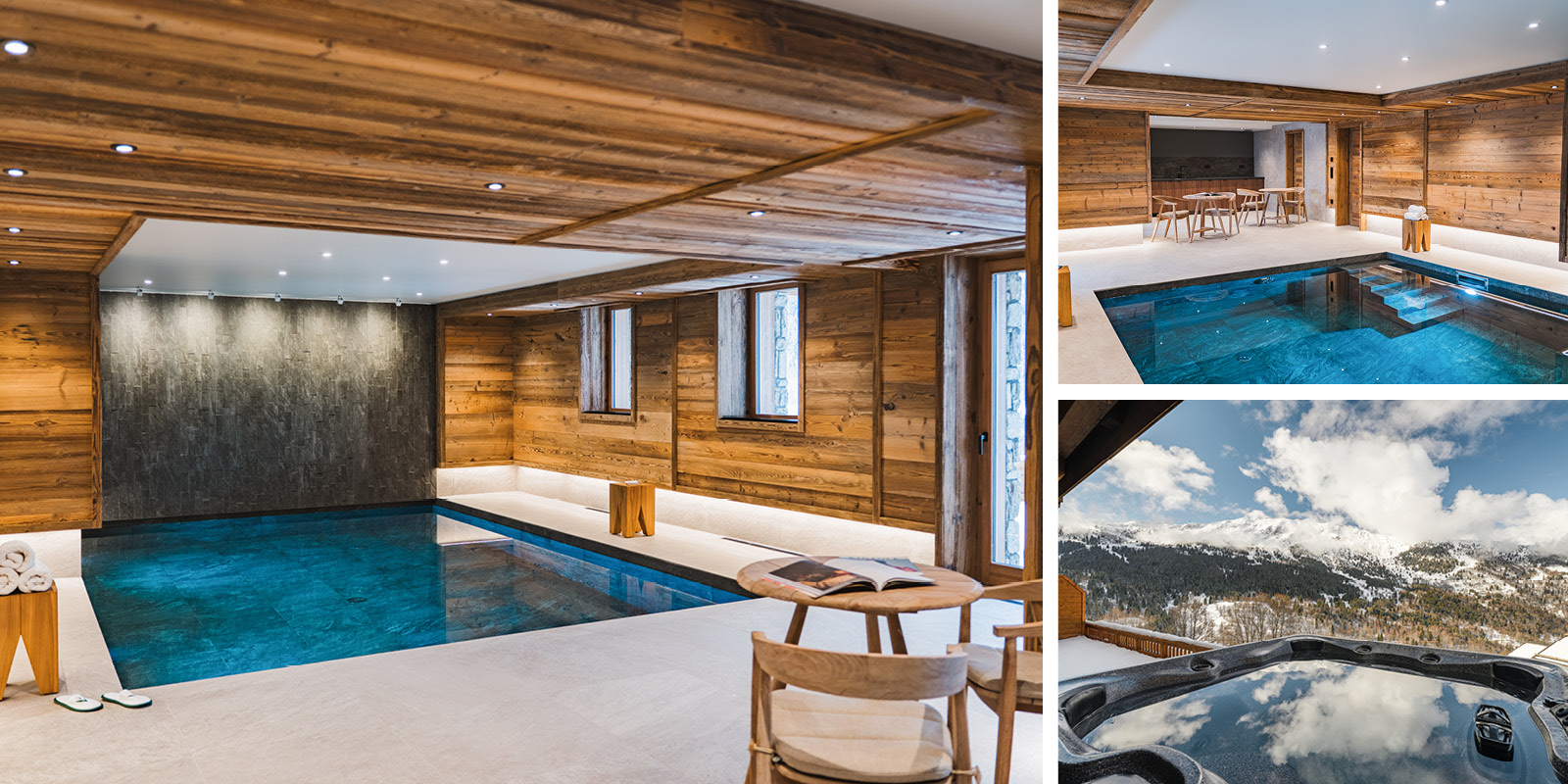 « Une des pièces les plus spéciales de ce chalet : la piscine privée. Elle est unique dans ce projet car elle offre une vue et une lumière extérieure grâce à son balcon et ses baies vitrées, ce qui est rare et en fait un atout. Elle est également pensée dans le détail avec un espace bar, un espace de relaxation et dotée d’un système audio pour une expérience encore plus haut de gamme. »